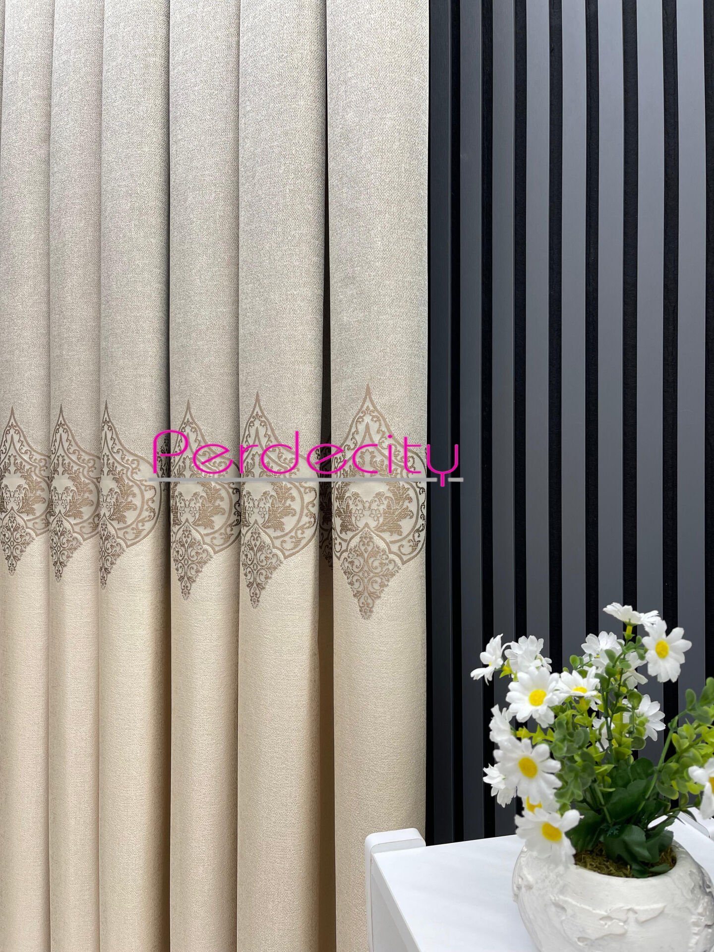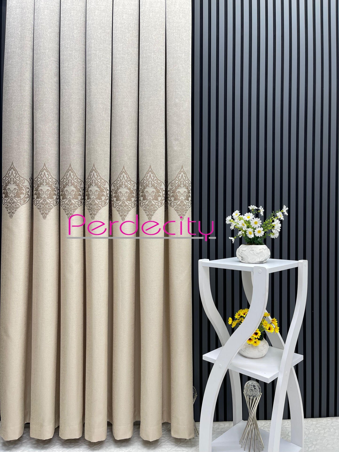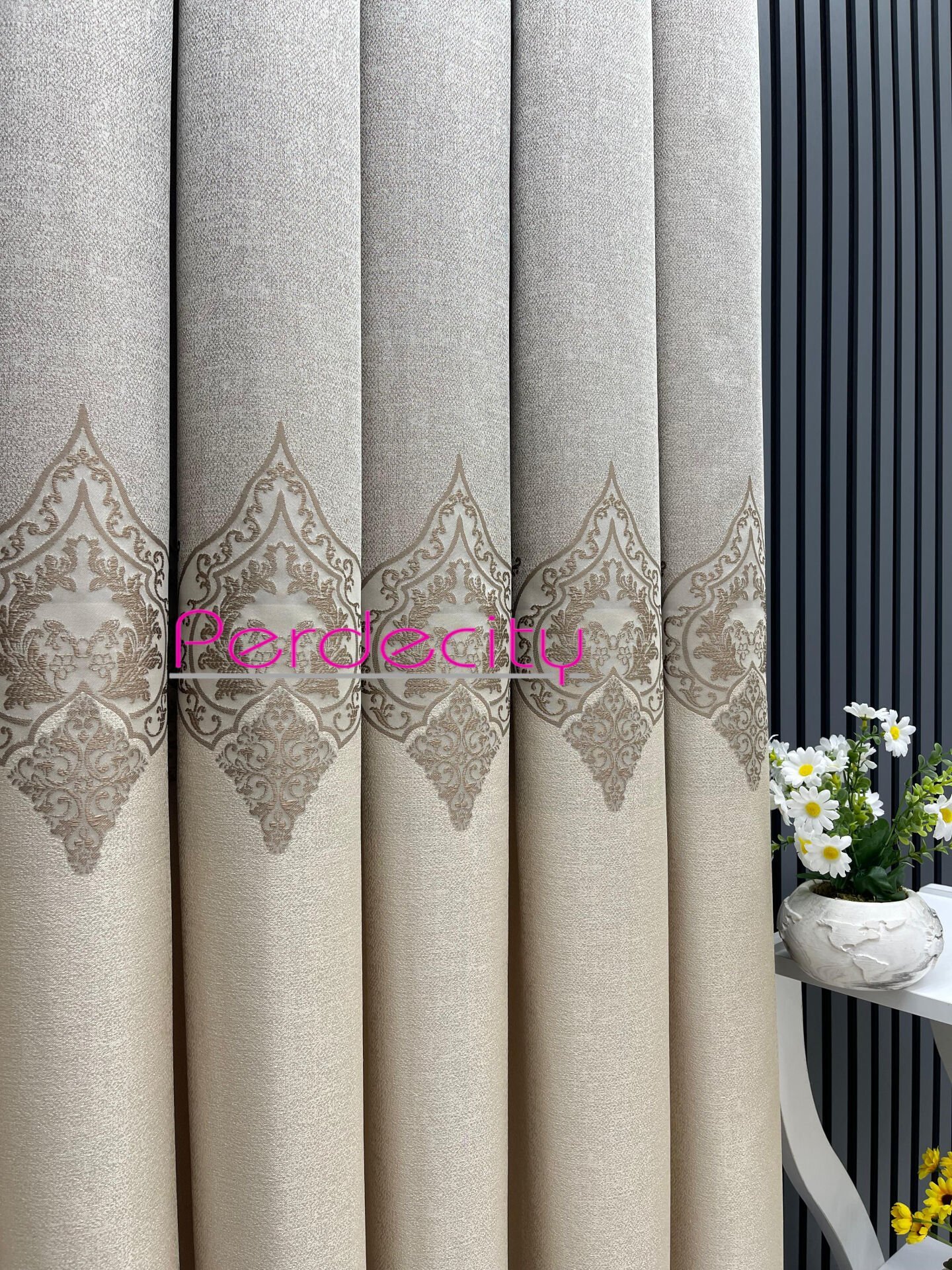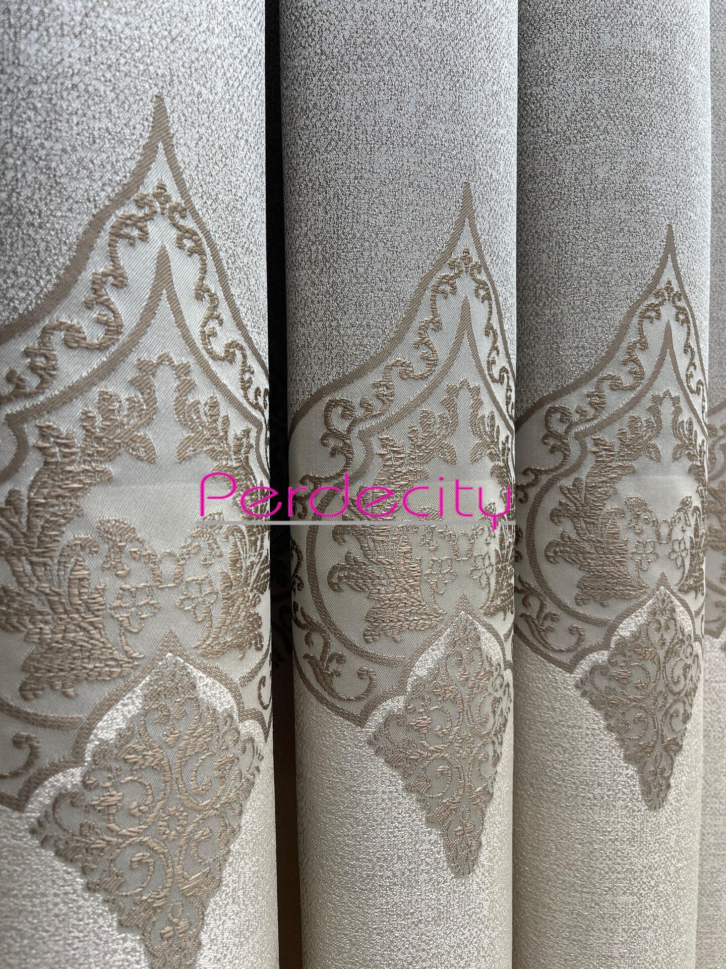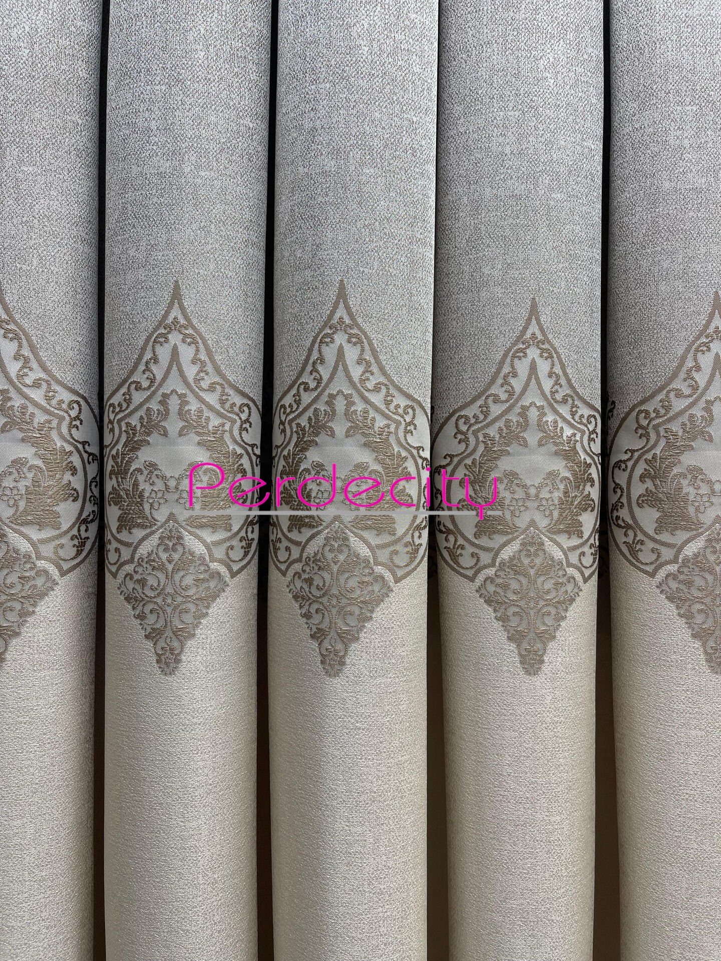 zeus krem vizon ortası osmanlı desen pano fon perde 1x3 sık pile [tek kanat]